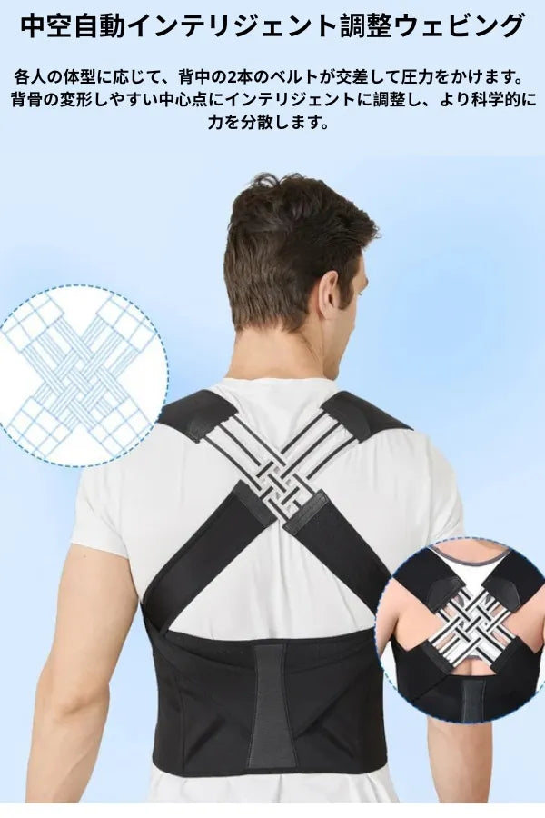 背骨の自然なカーブをサポートし、肩を優しく後ろに引くことで、姿勢を改善し、猫背を軽減します。
